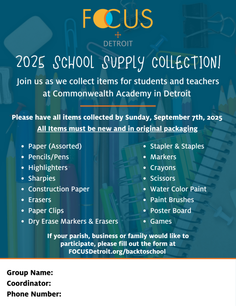 In the second-half of the summer, FOCUS Detroit collects items for schools in the city. We are especially working with Commonwealth Community Development Academy this year as we have developed deep and meaningful relationships with the students, their families, and the staff at the school.